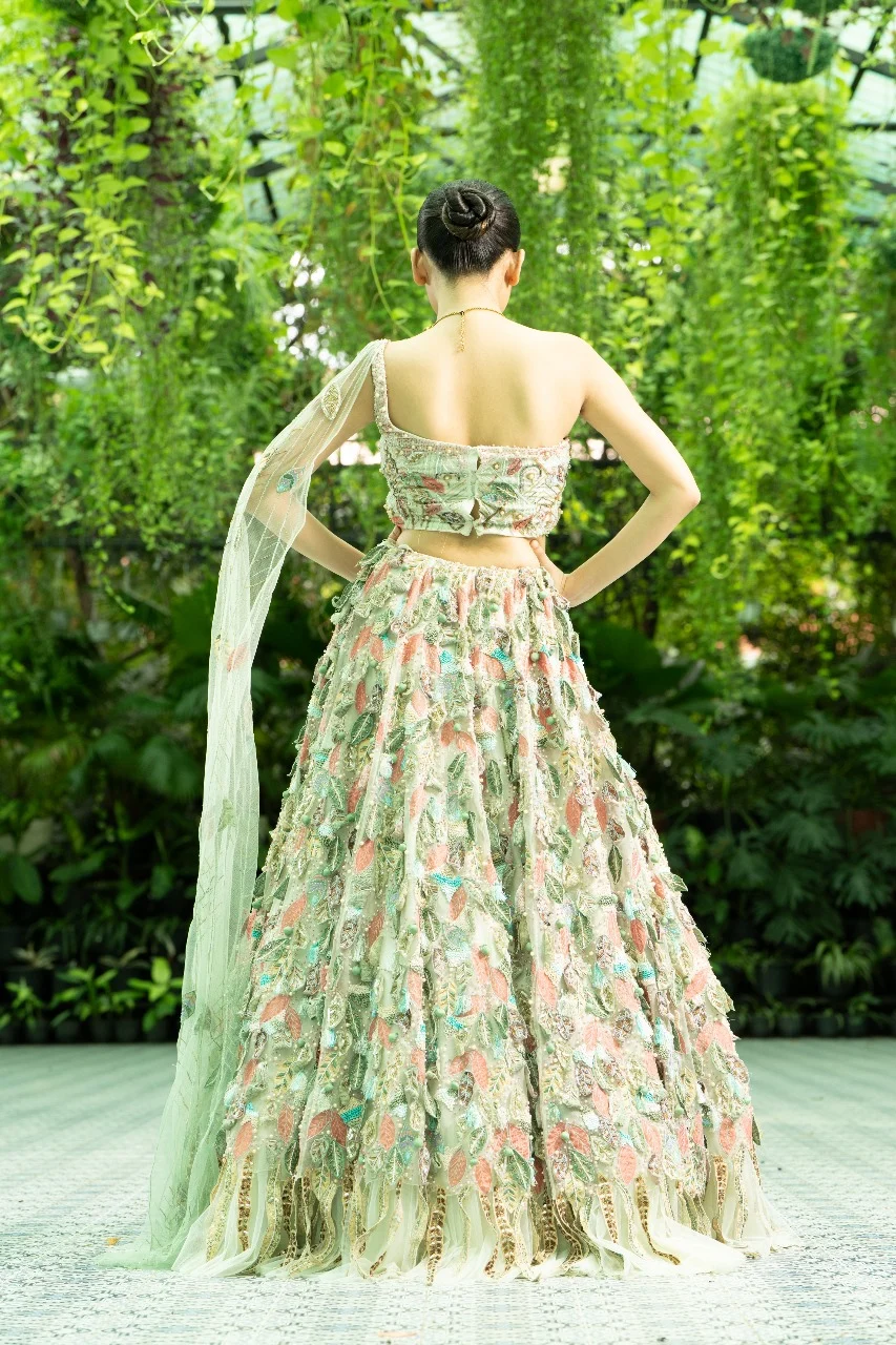 Description: Radiate grace with this light-green organza lehenga, adorned with beautiful hand embroidery. The lightweight fabric ensures ease of movement, while the padded blouse provides a flawless fit. Customize it to create your perfect look for any special occasion.
